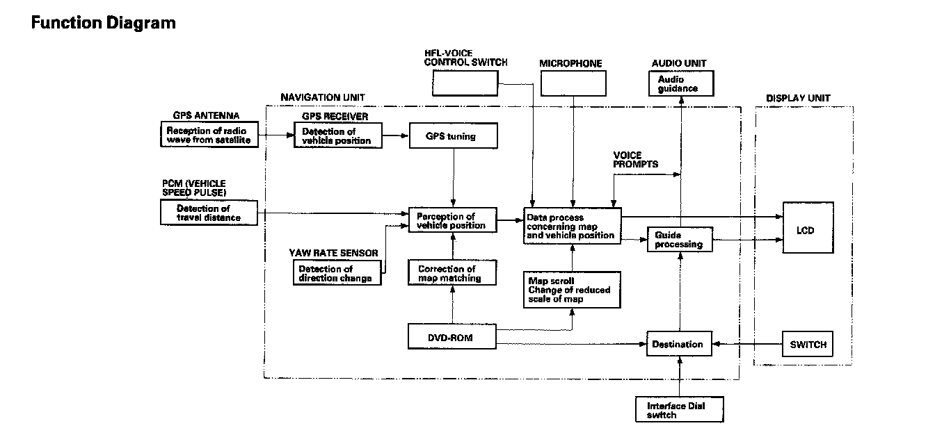 The navigation unit calculates the vehicle position and guides you to the destination. The unit performs map matching correction, GPS correction, and distance tuning. It also controls the menu functions and the DVD-ROM drive, and interprets voice commands. With control of all these items, the navigation unit makes the navigation picture color signal, then it transmits the signal to the Navigation display unit and audio driving instructions to the audio unit.