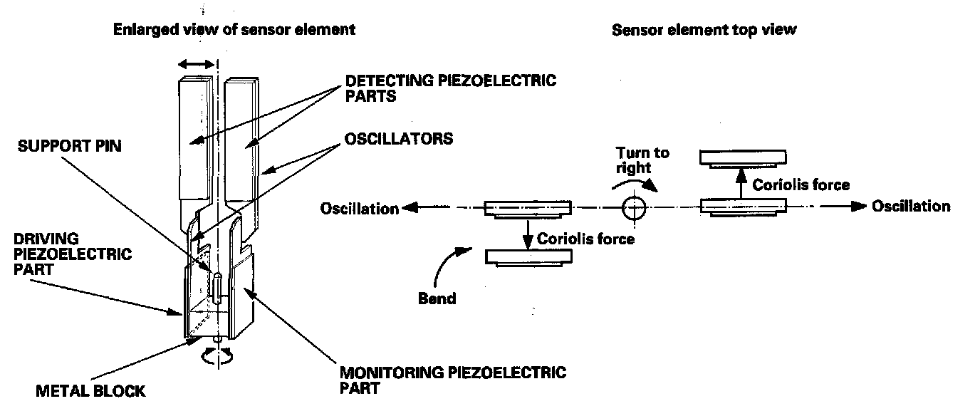 The piezoelectric parts have "electric/mechanical transfer characteristics." They bend vertically when voltage is applied to both sides of the parts, and voltage is generated between both sides of the piezoelectric parts when they are bent by an external force. The oscillation gyro functions by utilizing this characteristic of the piezoelectric parts and "Coriolis force." (Coriolis force deflects moving objects as a result of the earth's rotation.) In the oscillation gyro, this force moves the sensor element when angular velocity is applied.