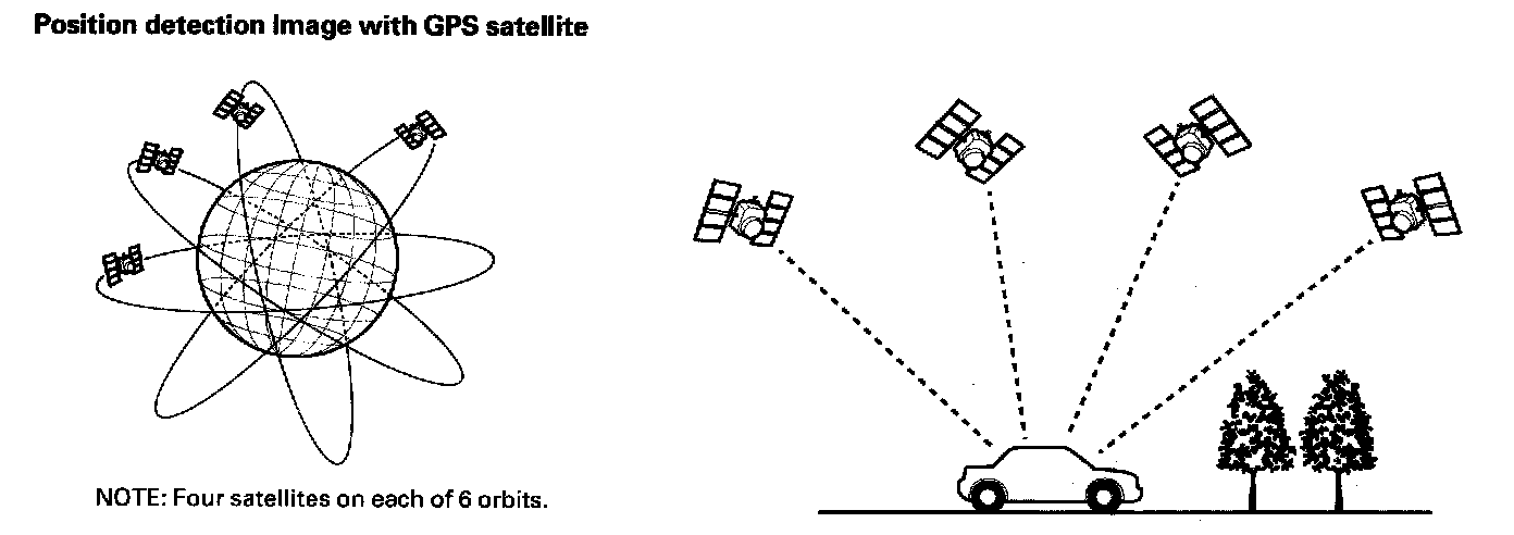 The global positioning system (GPS) enables the navigation system to determine the current position of the vehicle by utilizing the signals transmitted from the satellites in orbit around the earth. The satellites transmit the satellite identification signal, orbit information, transmission time signal, and other information. When the GPS receiver receives a signal from three or more satellites simultaneously, it calculates the current position of the vehicle based on the distance to each satellite and the satellite's position in its respective orbit.