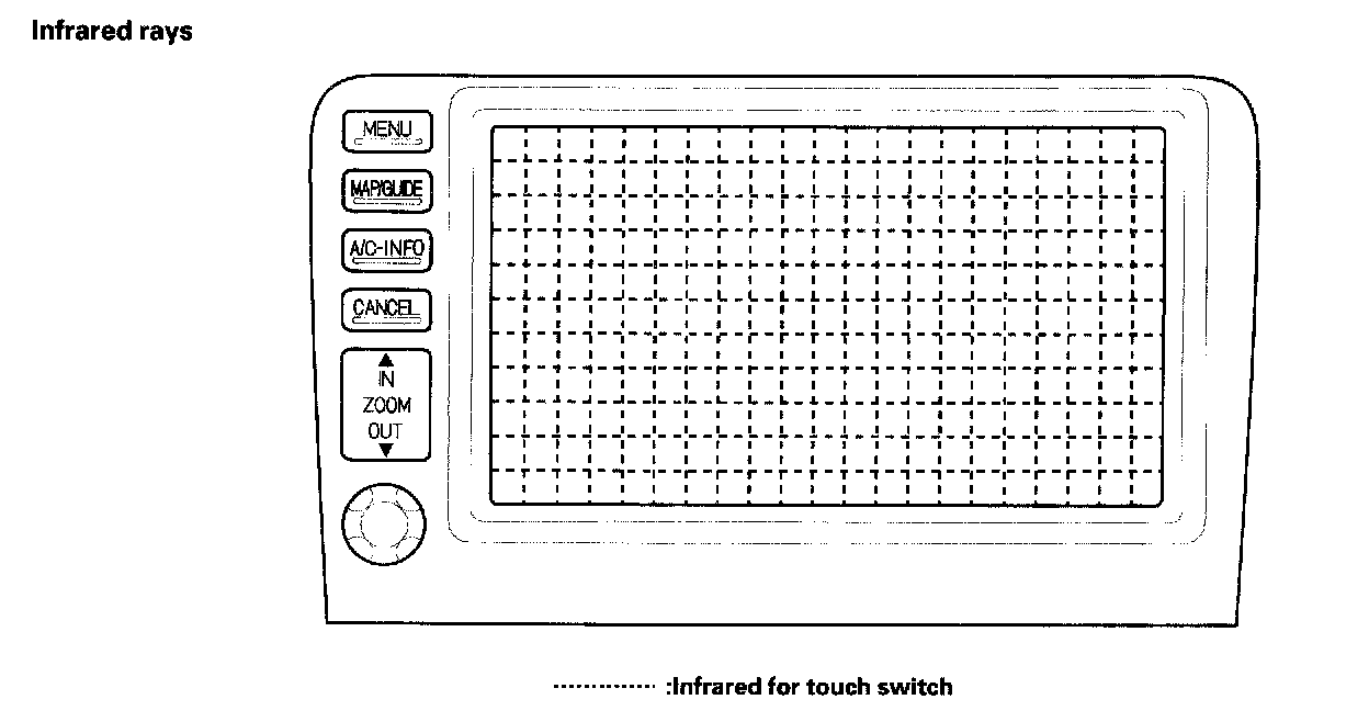 The Navigation Display unit uses liquid crystal display (LCD). The LCD is a 7-inch-diagonal, thin film transistor (TFT), stripe type with 330,960 picture elements. The color film and fluorescent light are laid out on the back of the liquid crystal film. The touch sensor on the front of the LCD is an infra red type with 20 vertical and 10 horizontal infrared rays to produce 200 sensing points. The navigation display transmits the signal from each button and the touch screen commands to the navigation unit.