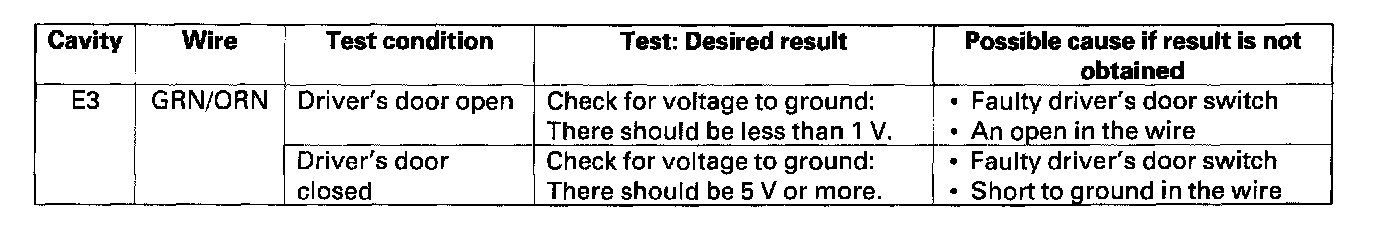 5. Reconnect the driver's multiplex control unit to the driver's under-dash fuse/relay box, turn the ignition switch ON (II) to keep the system awake, and make these input tests at the appropriate connectors on the driver's under-dash fuse/relay box.