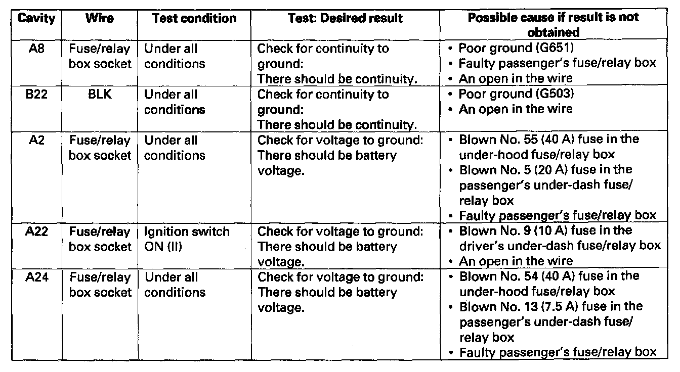 9. Reconnect the passenger's multiplex control unit to the passenger's under-dash fuse/relay box, and make these input tests at the appropriate connectors on the passenger's under-dash fuse/relay box.