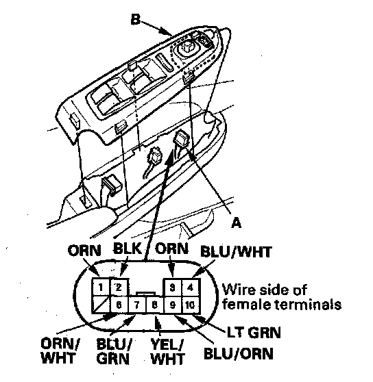 2. Disconnect the 10P connector (A) from the power mirror switch (B), and inspect the terminals. If OK, go to step 3.