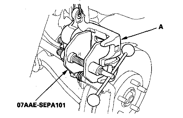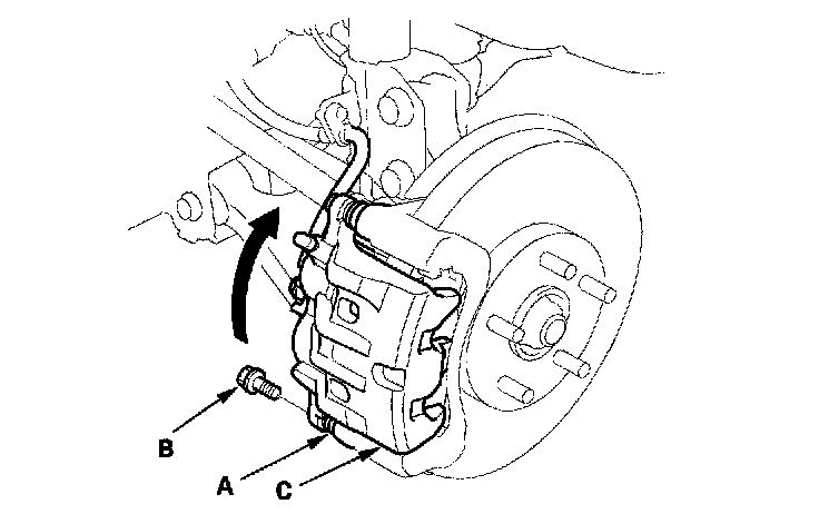 3. Remove the flange bolt (B) while holding the caliper pin A with a wrench being careful not to damage the pin boot, and pivot the caliper (C) up out of the way. Check the hose and-pin boots for damage and deterioration.