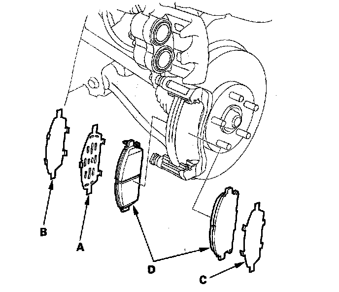 5. Remove the inner pad shim A, inner pad shim B, and outer pad shim (C) and brake pads (D).
