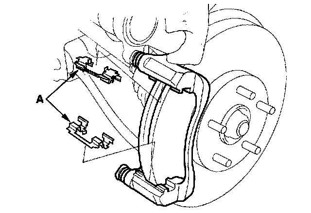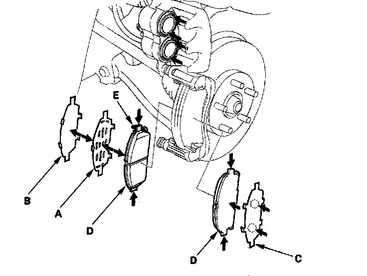 11. Install the brake pads and pad shims correctly. Install the brake pad with the wear indicator (E) on the upper inside. If you are reusing the brake pads, always reinstall the brake pads in their original positions to prevent a momentary loss of braking efficiency.
