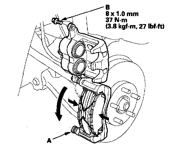 16. Pivot the caliper down into position. Install the flange bolt (B), and torque it to the specified torque while holding the caliper pin A with a wrench, being careful not to damage the pin boot.