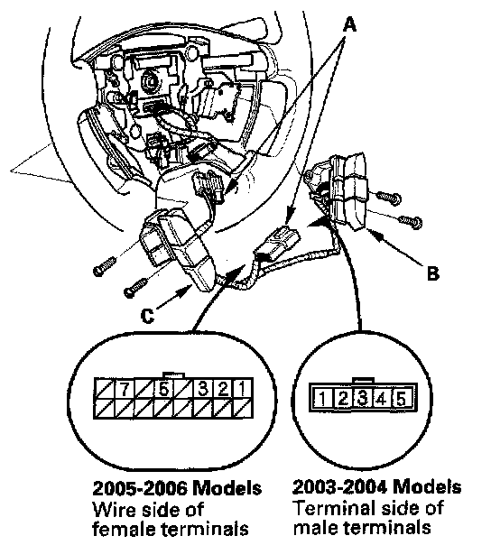 2. Disconnect the connectors (A), then remove the set/decel, resume/accel, cancel switch (B) and radio remote switch (C).