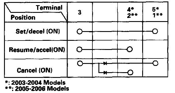 - If there is continuity, and it matches the table, but switch failure occurred on the cruise control input test, check and repair the wire harness on the switch circuit.