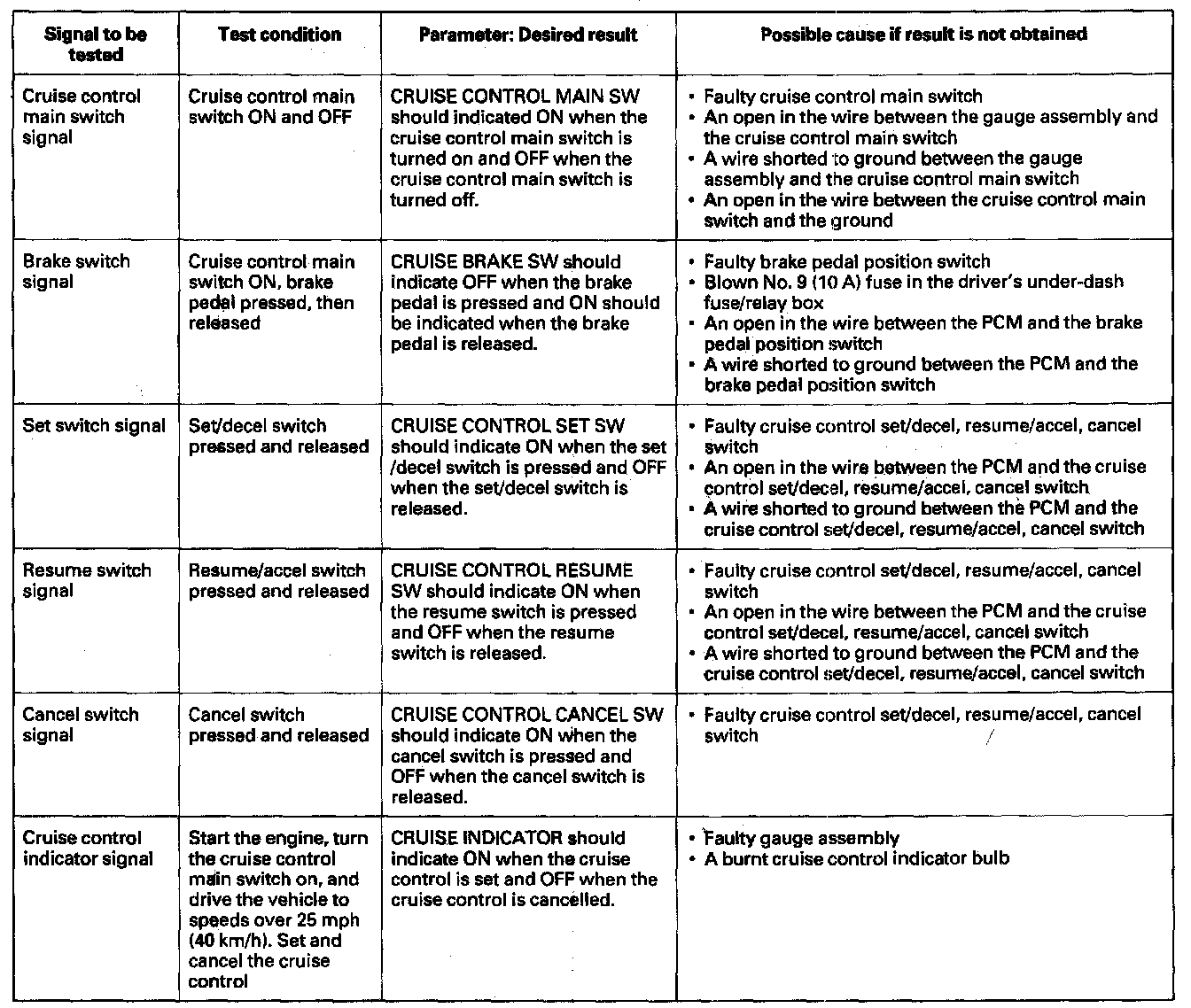 NOTE: Intermittent failures are often caused by loose circuit connections. While monitoring cruise control inputs, flex their circuits, and note if any of the test results change.