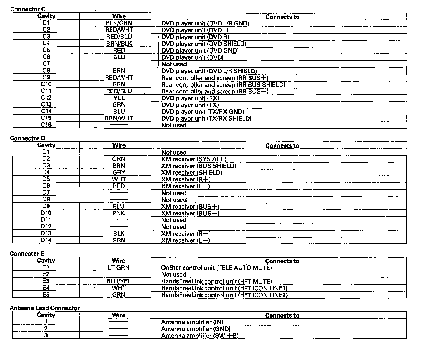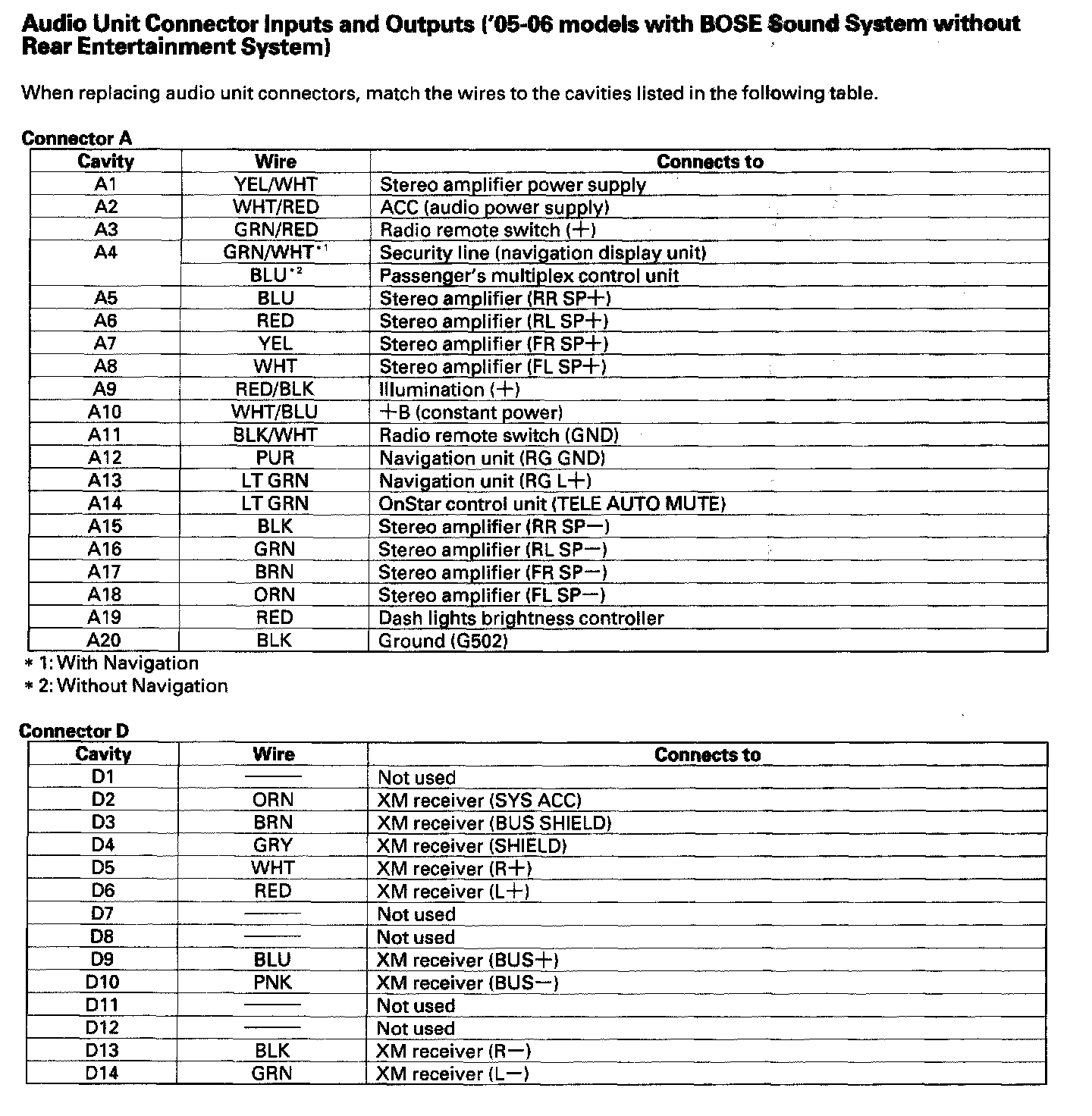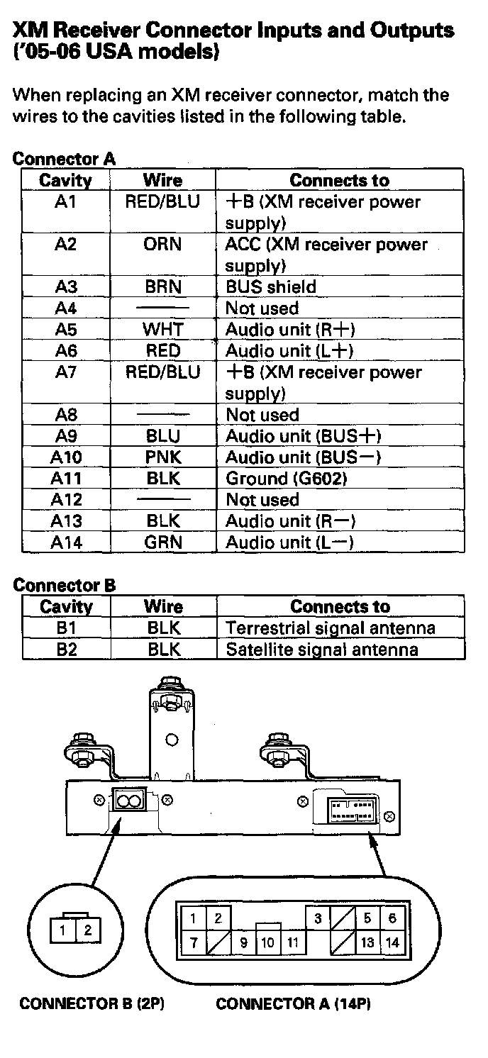 XM Receiver Connector Inputs and Outputs ('05-06 U.S.A. Models):