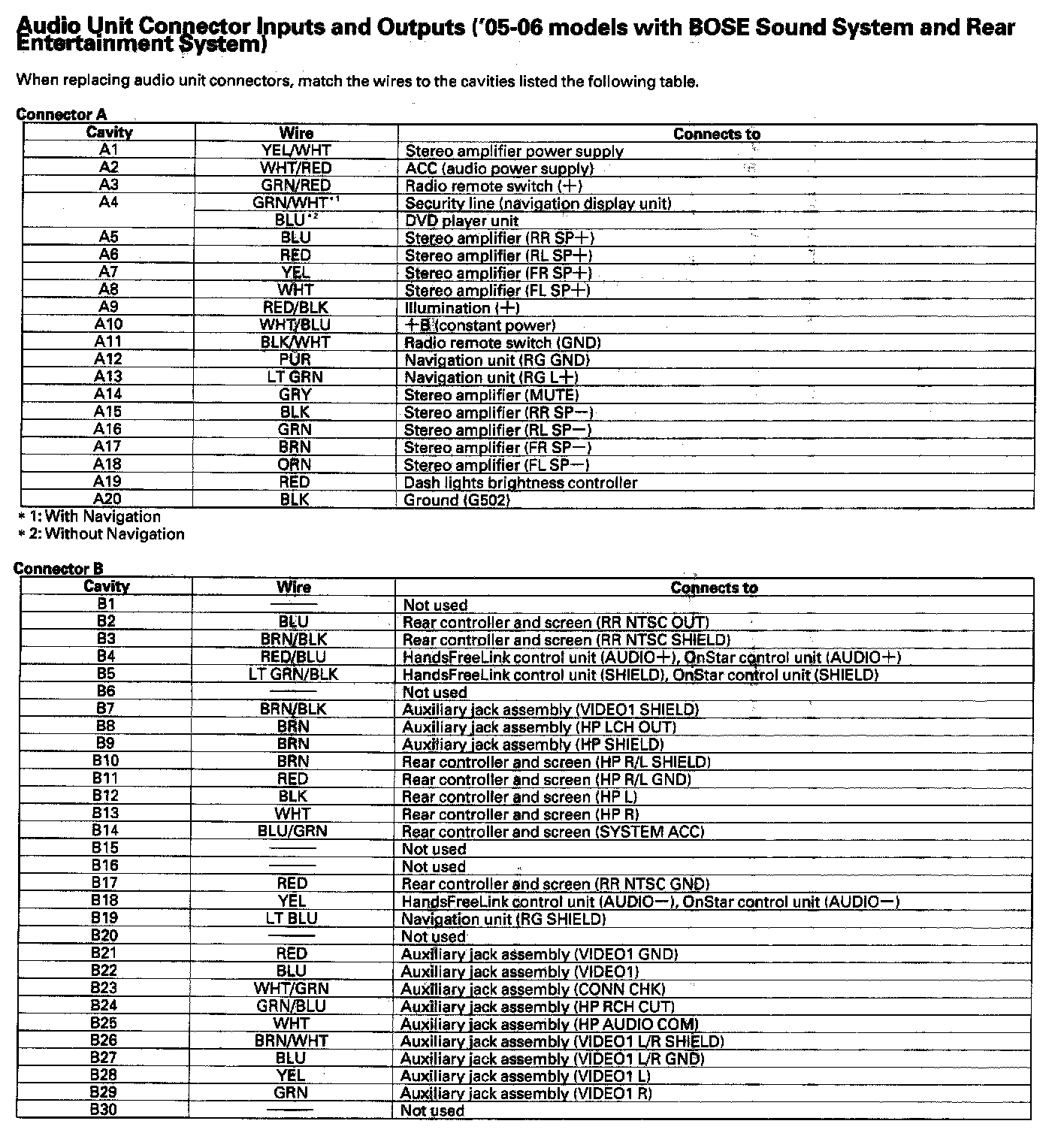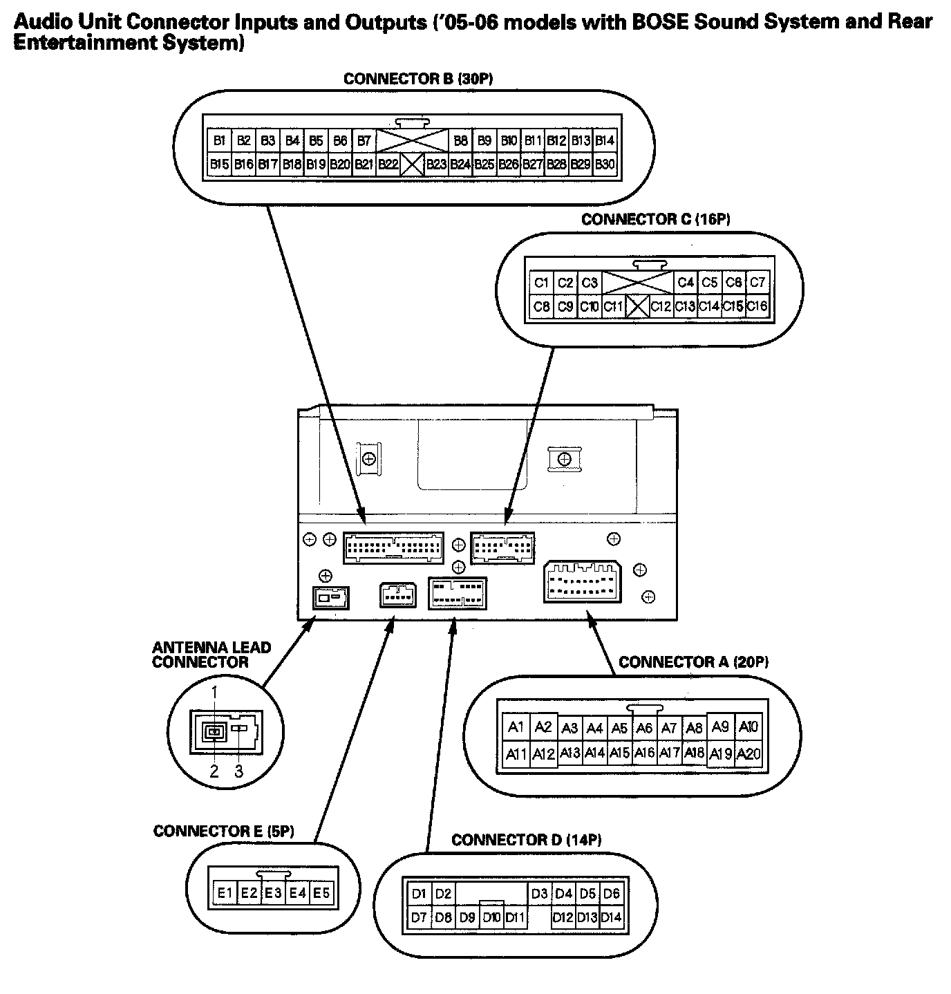 Audio Unit Connector Inputs And Outputs ('05-06 Model With BOSE Sound System With Rear Entertainment System) Part 1: