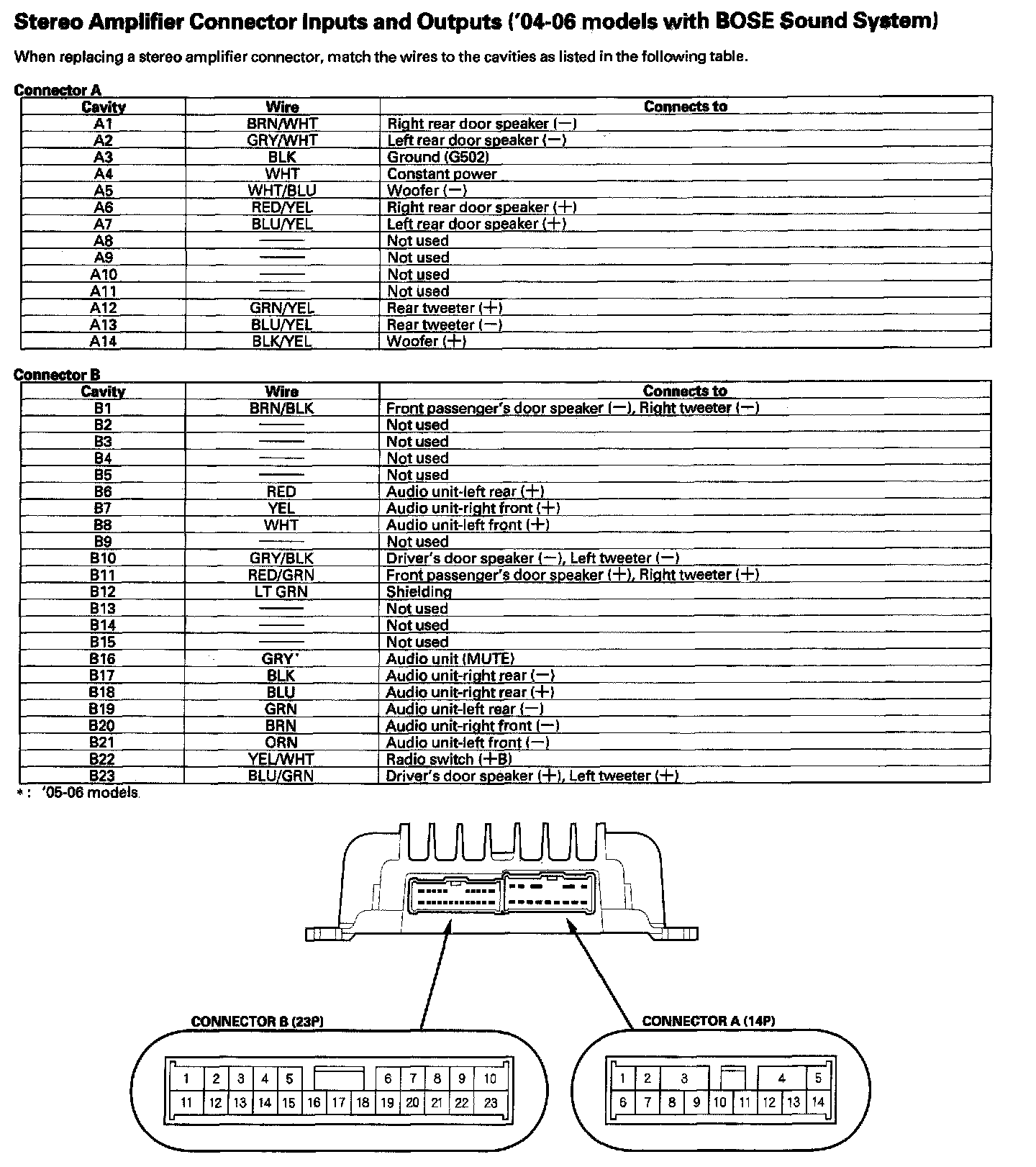 Stereo Amplifier Connector Inputs And Outputs ('04-06 Models With BOSE Sound System):