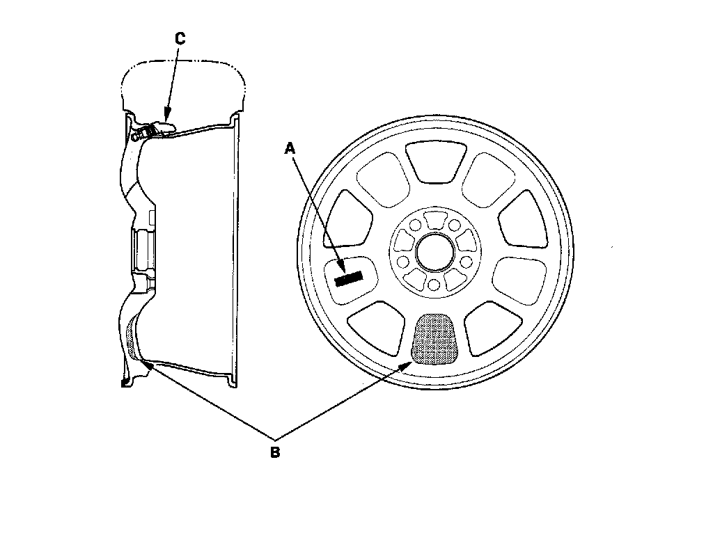 TPMS will not work unless TPMS type wheels are installed on the vehicle. The original equipment wheels have a TPMS mark on them (A), and a counterweight (B) cast into the opposite side of the rim to balance the weight of the sensor(C).