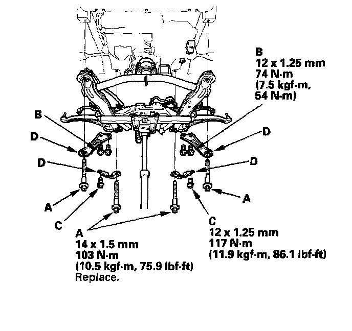 4. Loosely install the four front subframe mounting bolts (A) and the six 12 x 1.25 mm bolts (B), (C) with the stiffeners (D).