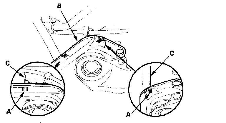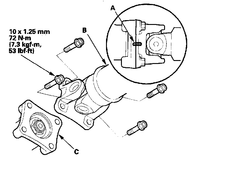 23. Align the reference marks (A) on the propeller shaft (B) and transfer shaft flange (C), then install the propeller shaft.
