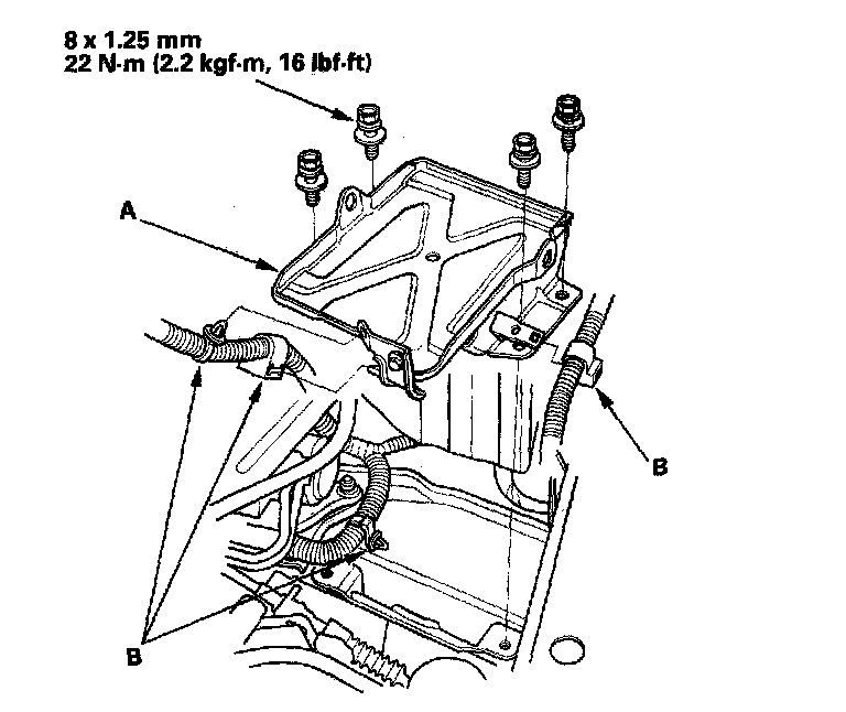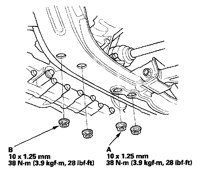 7. Tighten the transmission lower rear mount nuts (A) and transmission lower front mount nuts (B).