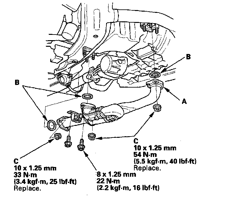 24. Install exhaust pipe A using new gaskets (B) and new self locking nuts (C).
