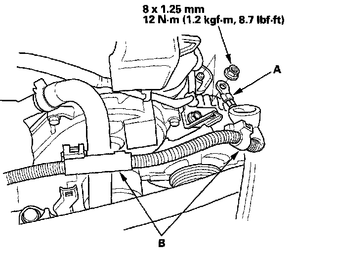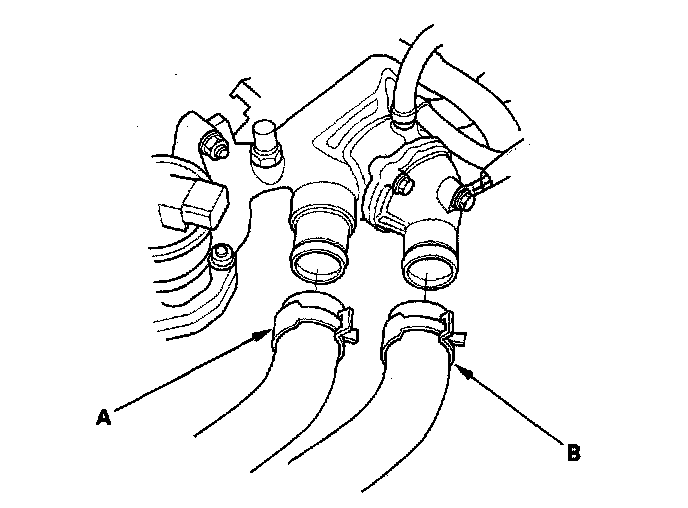 32. Install the upper radiator hose (A) and lower radiator hose (B).