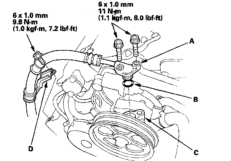 34. Install the power steering pump outlet hose (A) with a new O-ring (B) to the pump (C), and secure the hose clamp (D) with the bolt.