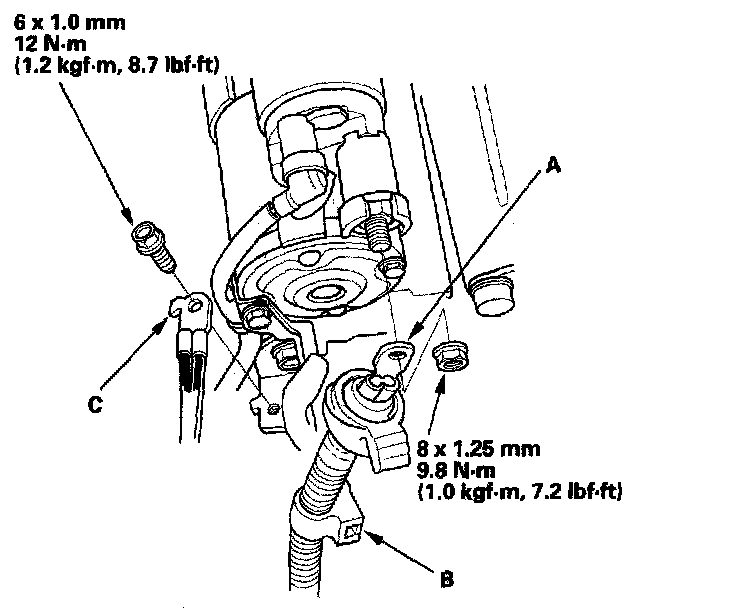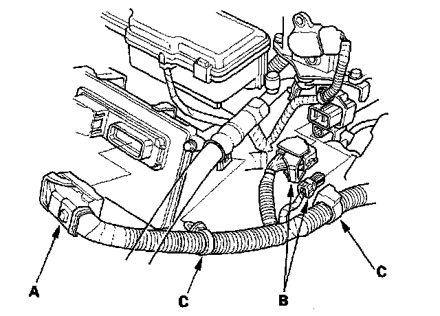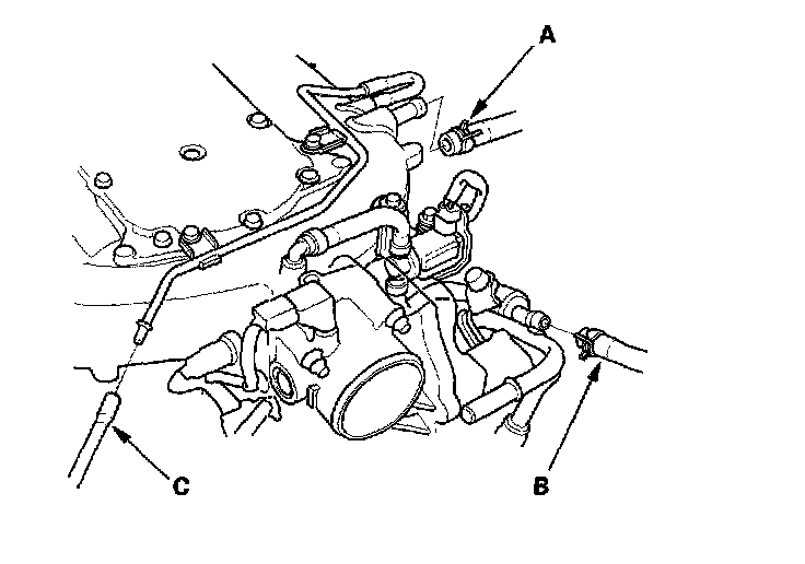 42. Install the brake booster vacuum hose (A), evaporative emission (EVAP) canister hose (B), and vacuum hose (C).