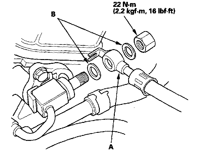 43. 2003-2004 models: Install the fuel feed hose (A) with new washers (B).