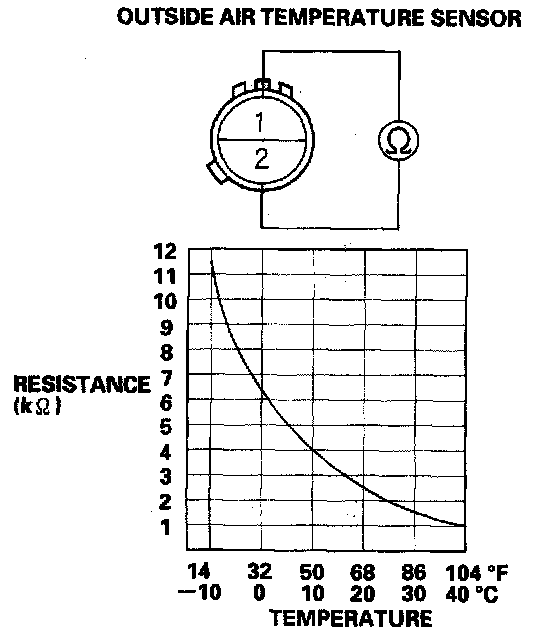 Compare the resistance reading between the No. 1 and No. 2 terminals of the outside air temperature sensor with the specifications shown in the graph; the resistance should be within the specifications.