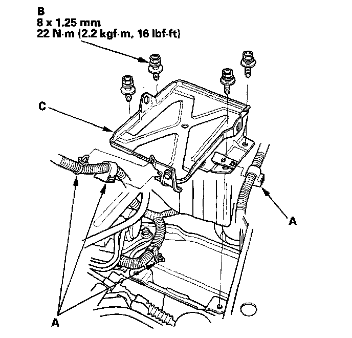 5. Remove four mounting bolts (B), then remove the battery base (C).