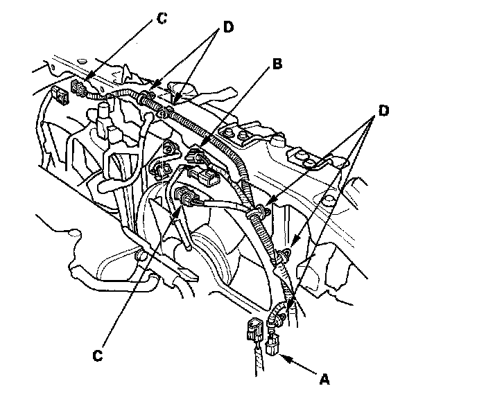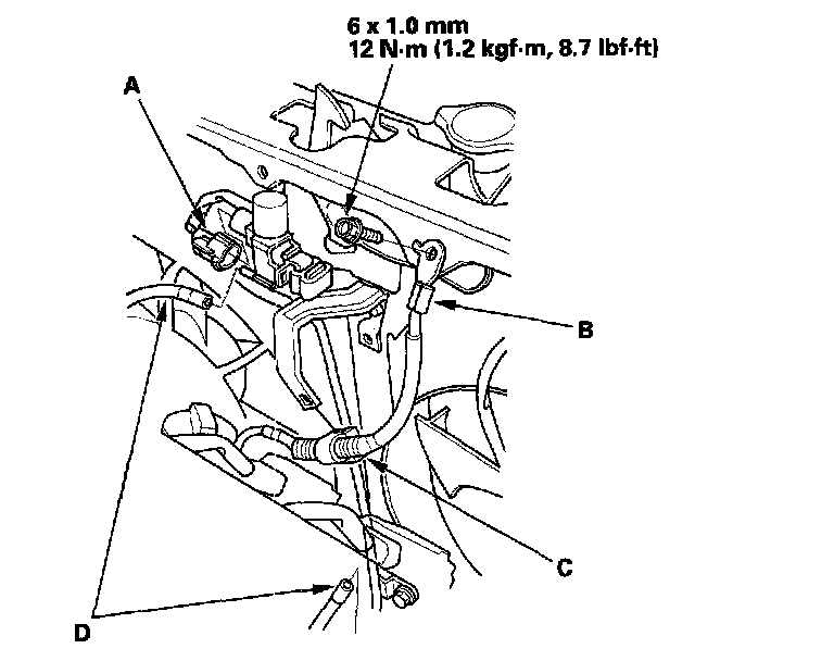 10. Remove the ground cable (B), harness clamp (C), and vacuum hoses (D).