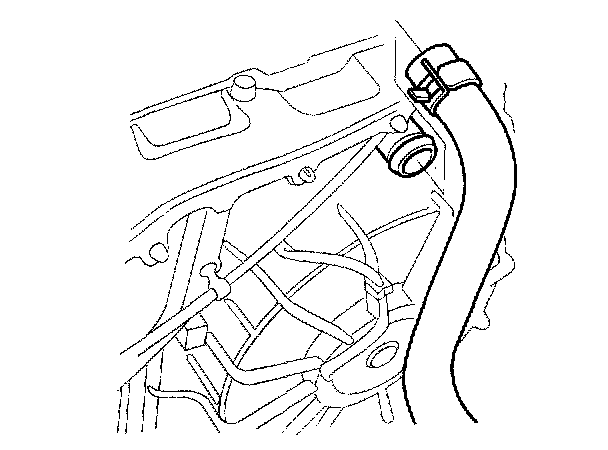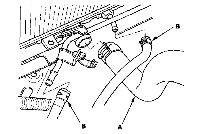 16. Remove the lower radiator hose (A) and automatic transmission fluid (ATF) cooler hoses (B). Plug the ATF cooler hoses and lines.
