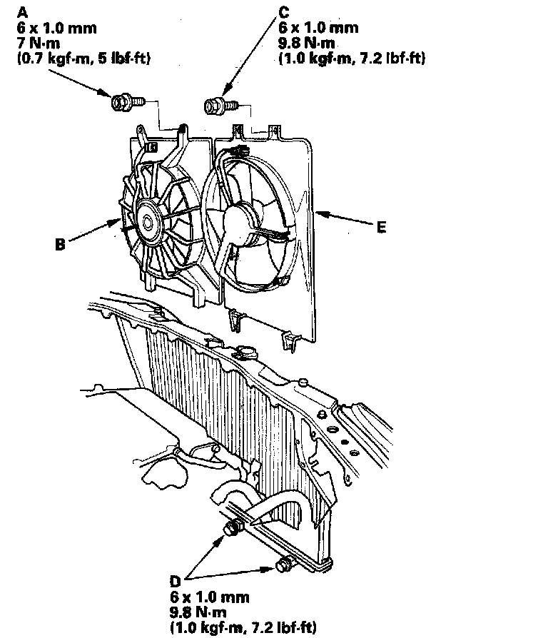 15. Remove the two bolts (C), and loosen the two bolts (D) securing the A/C condenser fan shroud, then remove the A/C condenser fan shroud assembly (E) from the battery side.