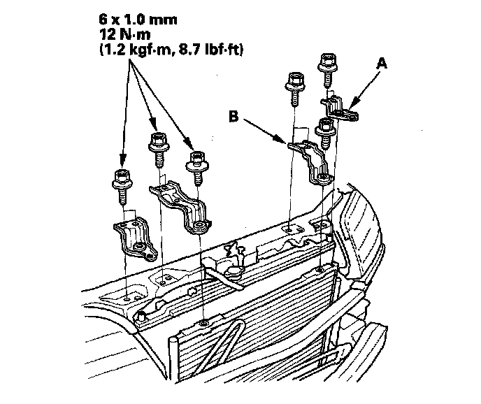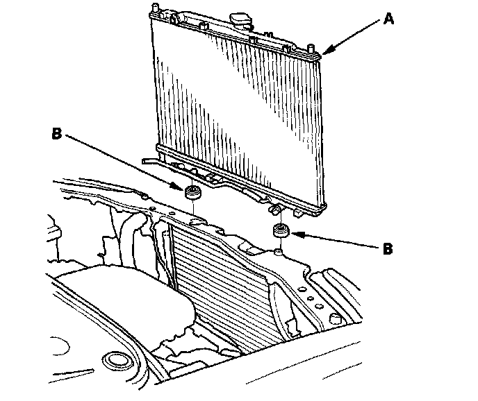 17. Remove the radiator upper brackets/cushions (A) and condenser brackets (B).