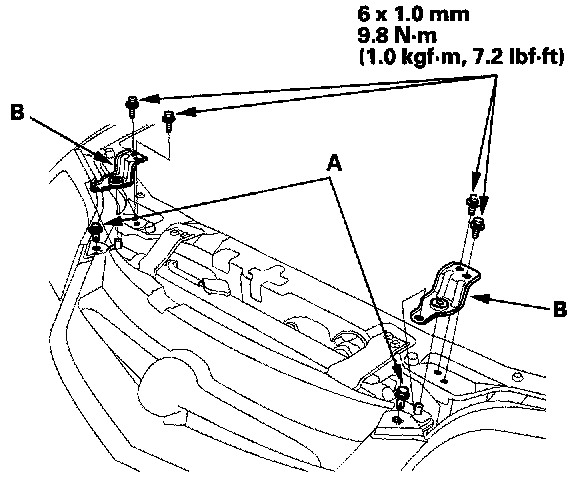3. Remove the clips (A), then remove the bolts and the radiator upper mount brackets (B).