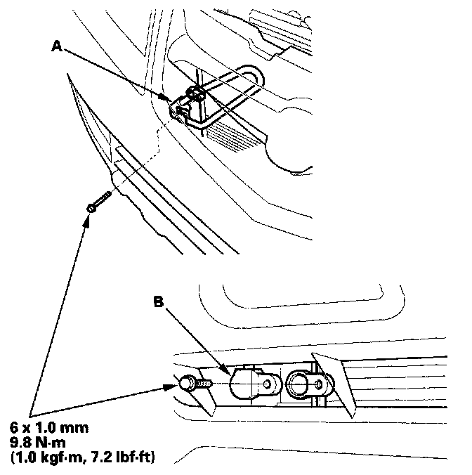 4. Remove the bolts, then disconnect the discharge line (A) and receiver line (B) from the A/C condenser. Plug or cap the lines immediately after disconnecting them to avoid moisture and dust contamination.