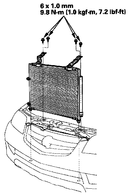 5. Remove the bolts, then remove the A/C condenser by lifting it up. Be careful not to damage the radiator and A/C condenser fins when removing the A/C condenser.
