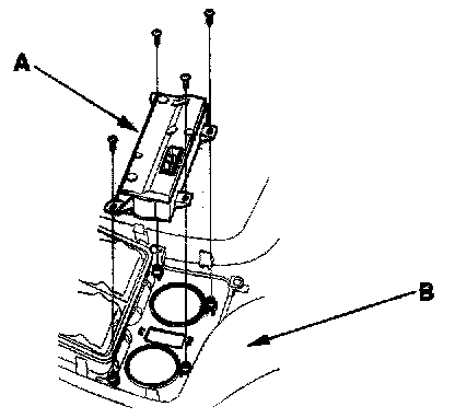 2. Remove the self-tapping screws and the rear heater-A/C control panel-unit (A) from the console rear trim (B).