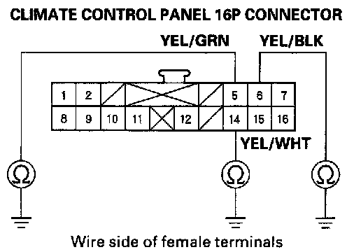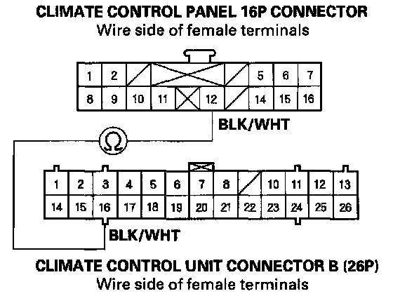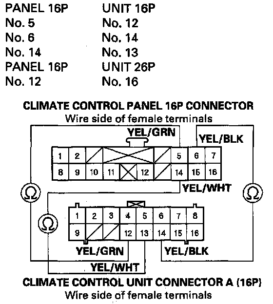 7. Check for continuity between the mentioned terminals of the climate control panel 16P connector and climate control unit connectors A (16P) and B (26P).