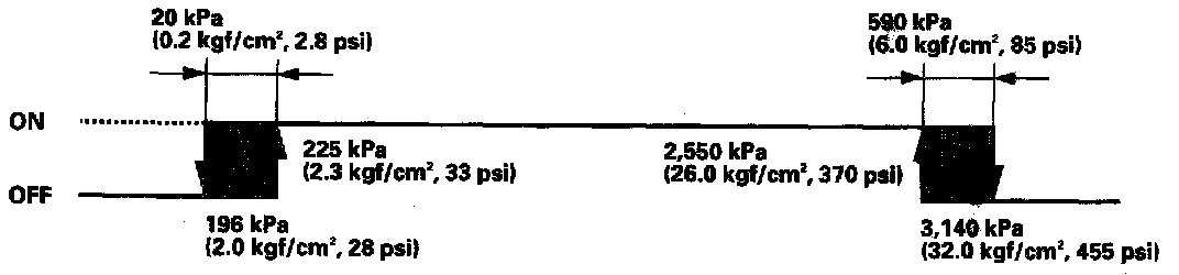 If the refrigerant pressure goes above or below 1,520 kPa (15.5 kgf/sq.cm, 220 psi), the A/C pressure switch opens or closes to signal the PCM to change the speed of the A/C condenser fan and radiator fan (high-low).