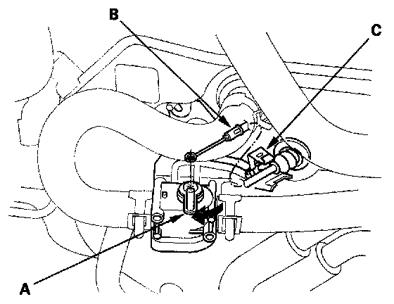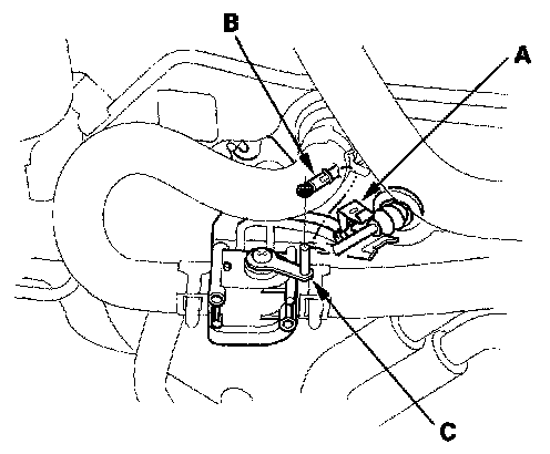 Heater Valve Cable Adjustment1. From under the hood, open the cable clamp (A), then disconnect the heater valve cable (B) from the heater valve arm (C).