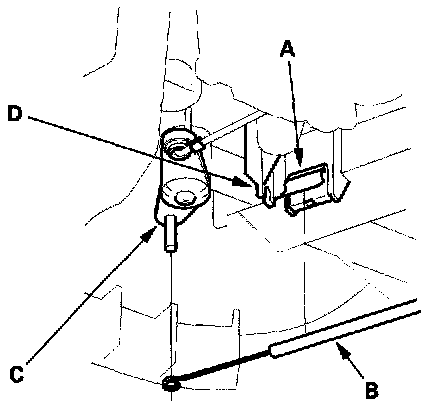 4. Attach the heater valve cable (B) to the air mix control linkage (C) as shown in step 2. Hold the end of the heater valve cable housing against the stop (D), then snap the heater valve cable housing into the cable clamp (A).