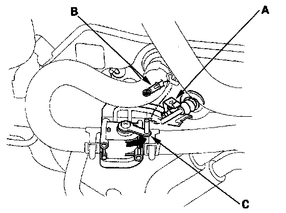 3. From under the hood, open the cable clamp (A), then disconnect the heater valve cable (B) from the heater valve arm (C). Turn the heater valve arm to the fully opened position as shown.
