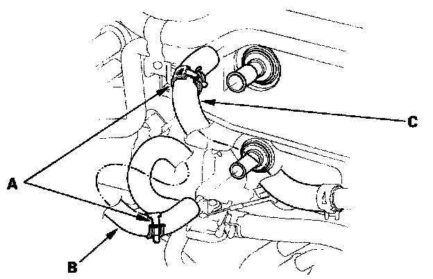 5. Slide the hose clamps (A) back, then disconnect the inlet heater hose (B) and the outlet heater hose (C) from the heater unit. Engine coolant will run out when the hoses are disconnected; drain it into a clean drip pan. Be sure not to let coolant spill on the electrical parts or the painted surfaces. If any coolant spills, rinse it off immediately.