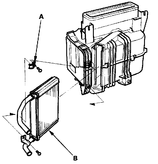 10. Remove the self-tapping screws and the clamp (A), then carefully pull out the heater core (B) so you don't bend the inlet and outlet pipes.