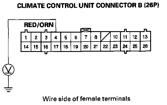 9. Measure the voltage between the No. 4 terminal of climate control unit connector B (26P) and body ground.