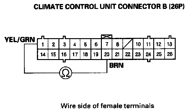 11. Measure the resistance between the No. 1 and No. 20 terminals of the climate control unit connector B (26P).