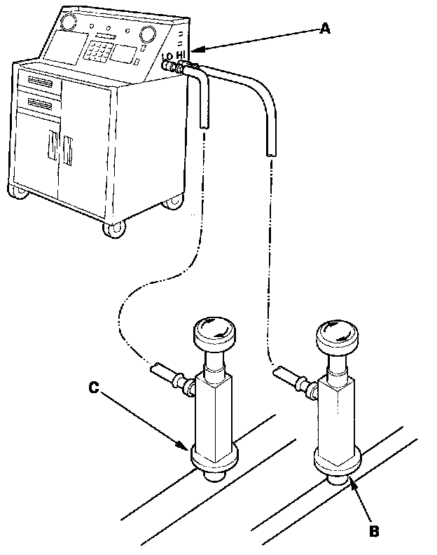 1. Connect an R-134a refrigerant recovery/recycling/charging station (A) to the high-pressure service port (B) and the low-pressure service port (C), as shown, following the equipment manufacturer's instructions.
