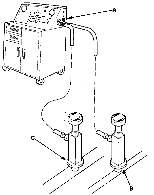 2. Connect an R-134a refrigerant recovery/recycling/charging station (A) to the high-pressure service port (B) and the low-pressure service port (C), as shown, following the equipment manufacturer's instructions. Evacuate the system.