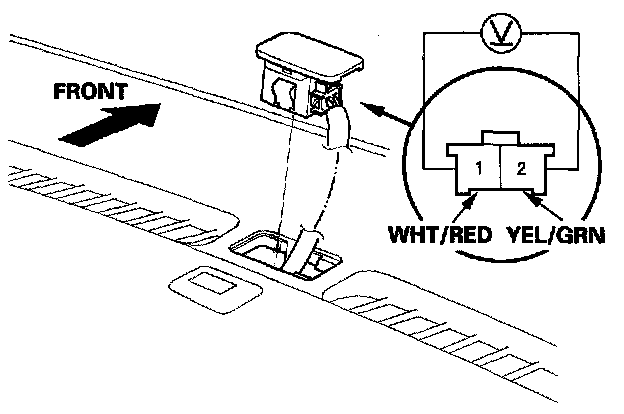 Turn the ignition switch ON (II). Measure the voltage between the terminals with the (+) probe on the No. 1 terminal and the (-) probe on the No. 2 terminal with the 2P connector connected. The voltage readings will not change under the light of a flashlight or a fluorescent lamp. Voltage should be: