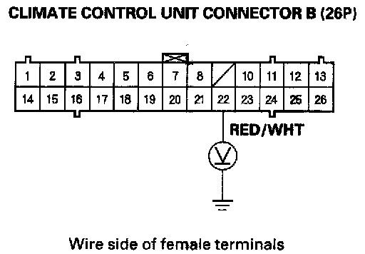 6. Measure the voltage between the No. 22 terminal of climate control unit connector B (26P) and body ground.