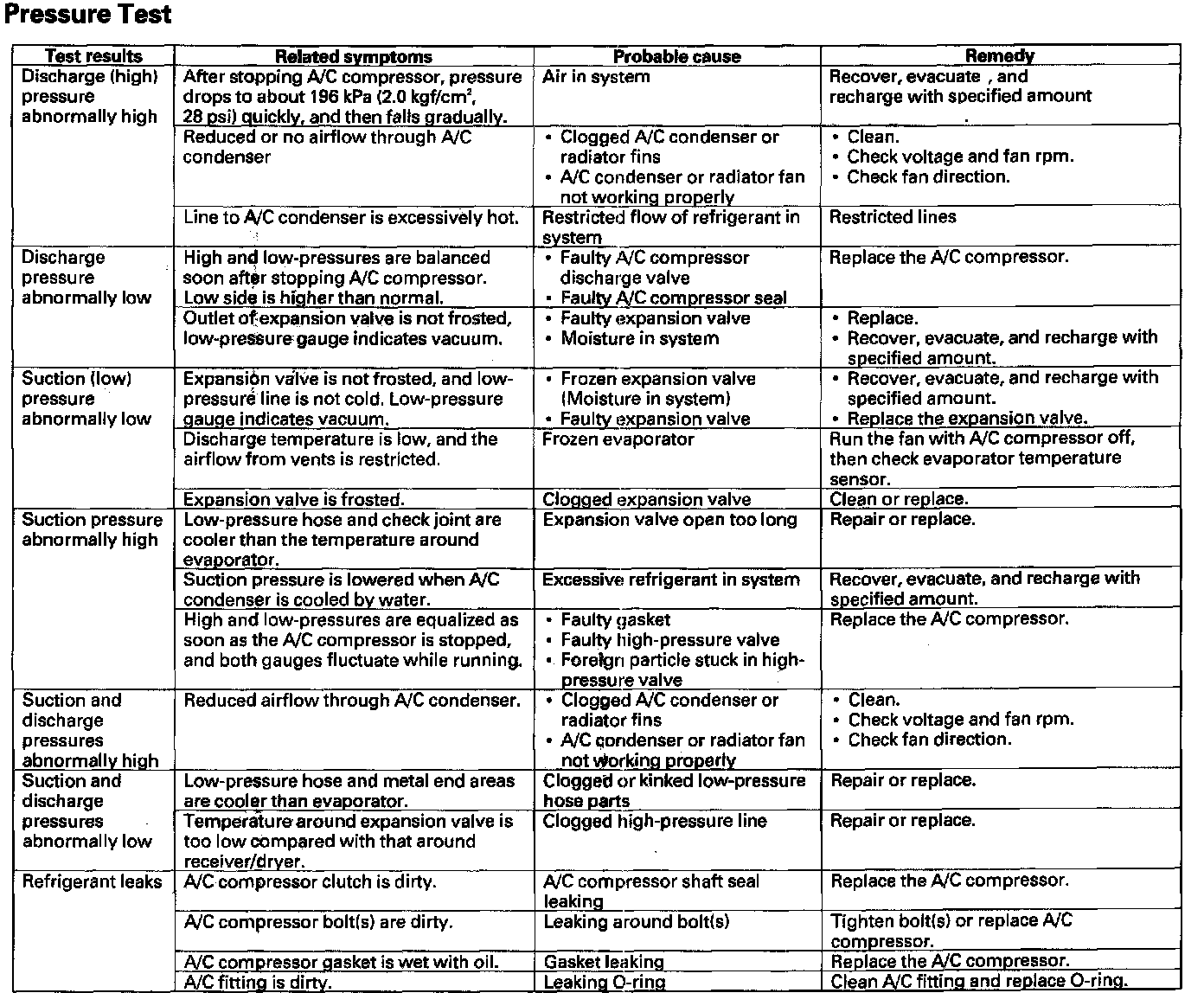 R-134a service equipment or vehicle air conditioning systems should not be pressure tested or leak tested with compressed air.